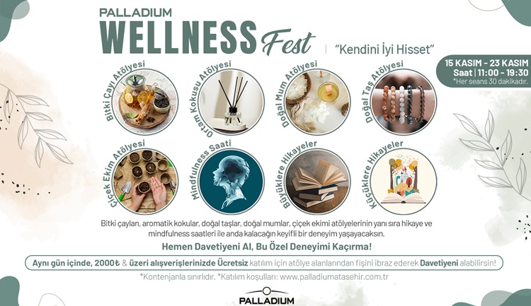 Şehrin kalabalığına kısa bir mola vermek, nefes almak ve kendine dönmek isteyenler için Palladium Wellness Fest Başlıyor! 15 – 23 Kasım 2025 tarihleri arasında Palladium Ataşehir Alışveriş Merkezin’de ’de dokuz gün sürecek festival, “Kendini İyi Hisset” temasıyla ziyaretçilerini benzersiz bir yolculuğa davet ediyor. Doğanın ilhamını, aromaların huzurunu, mindfulness’ın sakinliğini ve hikâyelerin şefkatini bir araya getiren Palladium Wellness Fest, şehir yaşamının tam ortasında içsel bir denge alanı yaratıyor.